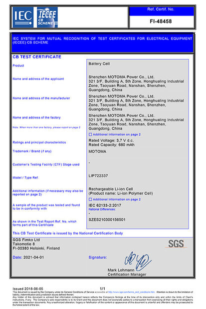 MOTOMA 배터리는 ISO9001, ISO14001, RoHS, UL, CE, CB, PSE, KC, IEC62133 BIS, CQC, UN38.3 및 MSDS 인증서와 함께 적용됩니다.